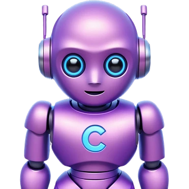 Cute mini robot character, purple body, white C symbol on the chest, soft neon glow, simple face with two bright blue eyes emoji
