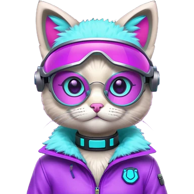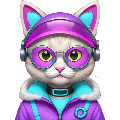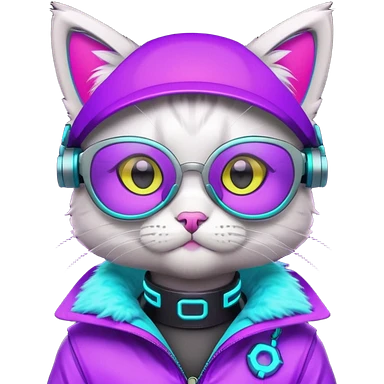 cute cyberpunk cat, neon visor glasses, tech jacket, glowing collar, purple and cyan neon accents, 3D cartoon, mobile game icon style, clean background, no text, no watermark emoji