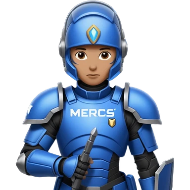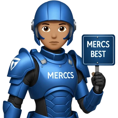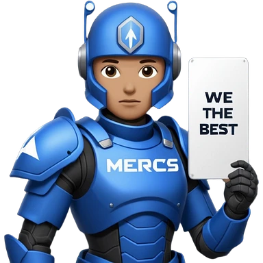 a scifi soldier in blue and black holding a sign saying Mercs, under this scifi in blue and black holding a sign is the text we are the best. in gif emoji