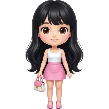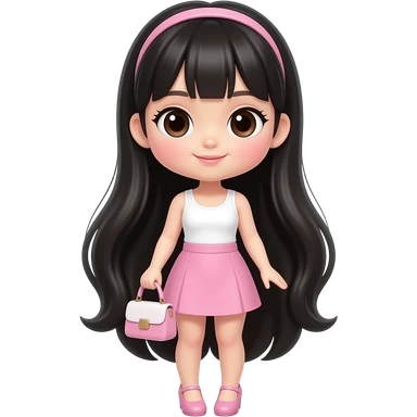 A cute, ethereal Asian doll-looking girl with long thick shiny black hair, dark brown almond-shaped eyes, full boy, light pink mini skirt, white tank top, light pink heels, light pink and white mini handbag, give more of emoji vibes and not muuch like drawing emoji