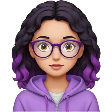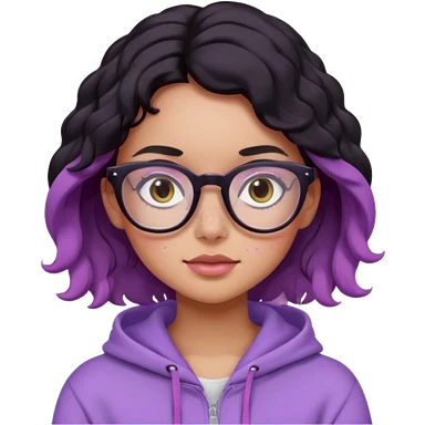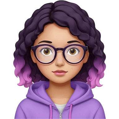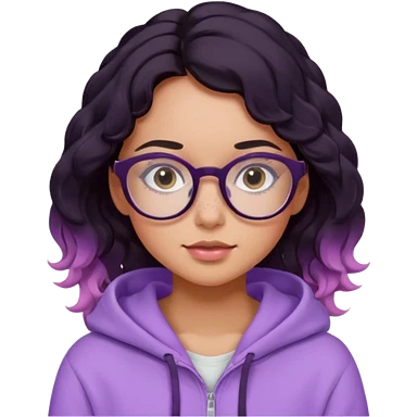 emoji of a woman, slighty tanned skin, cute freckles, pink cheeks, wavy black hair, big frame glasses and cute eyes, wearing a lilac hoodie emoji