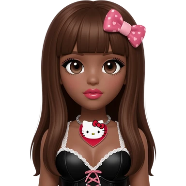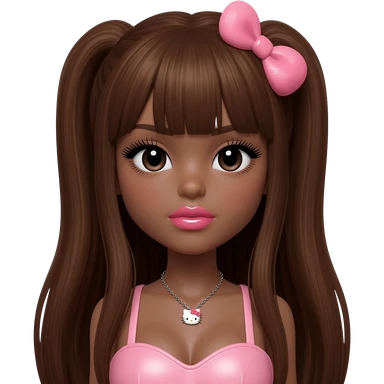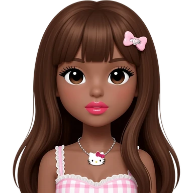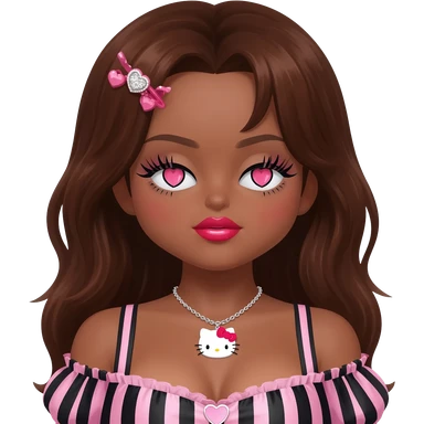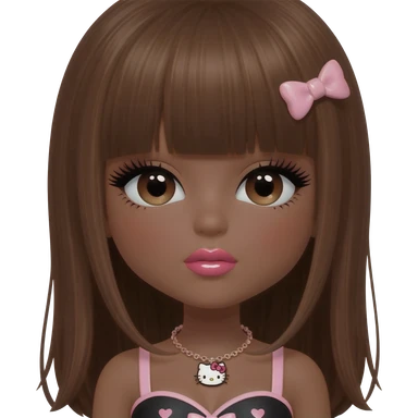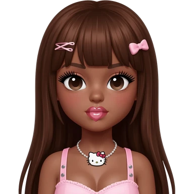 heart shaped lips, cute glossy lips, doll eyes with long lashes, dark brown skin, long brown hair, big chest, hello kitty necklace, one bow clip, bimbocore outfit emoji