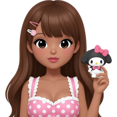 Gyaru makeup, my melody hairclip, cutecore, doll eyes, Doll, big chest, dark brown skin, with long brown hair , black cute eyes, cute lips with Gyaru outfit ( pink and white polkadots) emoji