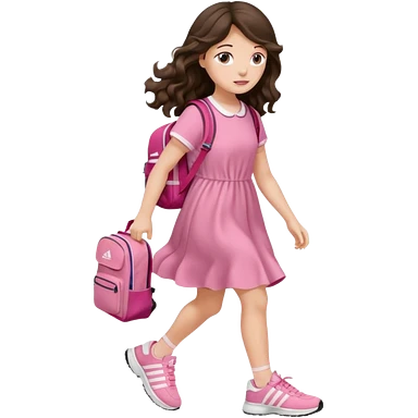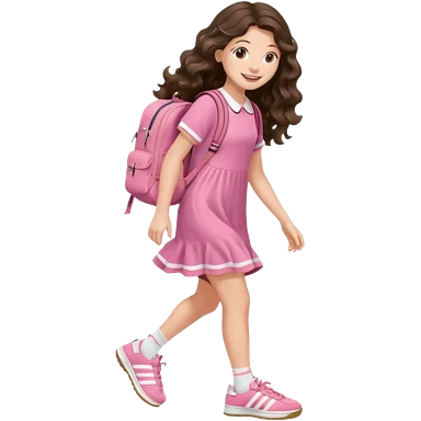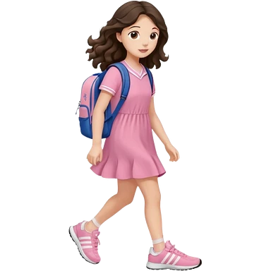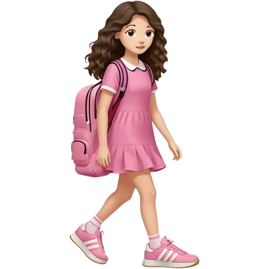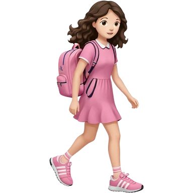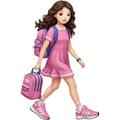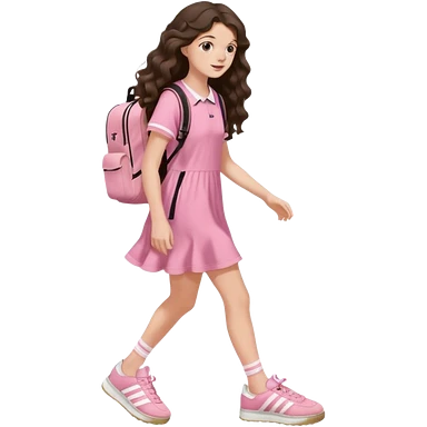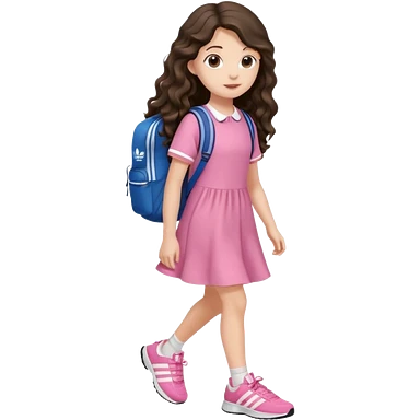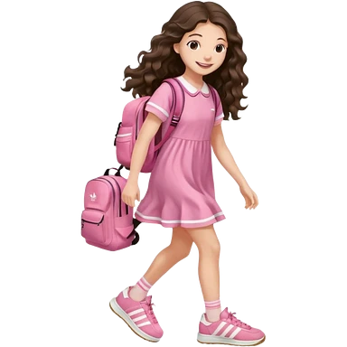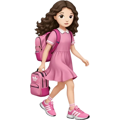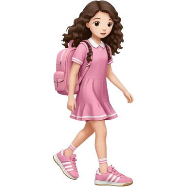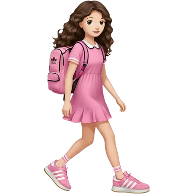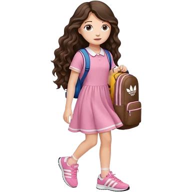 aestethic brunette very long wavy hair walking with a school backpack, with a cute pink dress, adidas shoes emoji