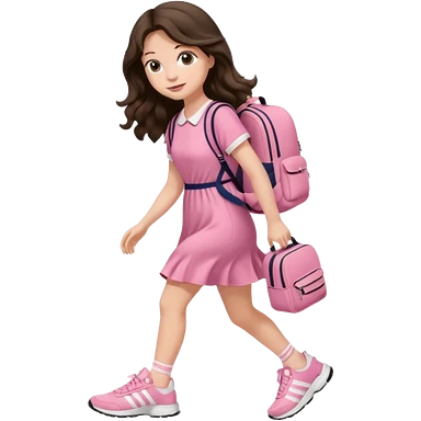 aestethic brunette very,very,very long wavy hair walking with a school backpack, with a cute pink dress, adidas shoes emoji