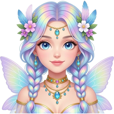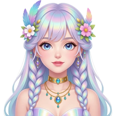 Beautiful gorgeous anime lady with beautiful iridescent-braided-hair, fashion aesthetic, ethereal, fairycore, pastelcore, feathers, flowers, gems, accessories, jewelries, gold, colorful emoji