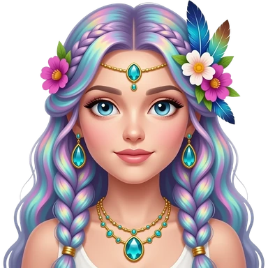 Beautiful gorgeous anime lady with beautiful iridescent-nebula-braided-hair, fashion aesthetic, ethereal, fairycore, pastelcore, feather, flowers, gems, accessories, jewelries, gold, colorful emoji