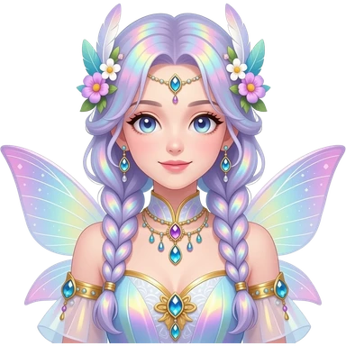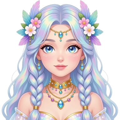 Beautiful gorgeous anime lady with beautiful iridescent-white-braided-hair, fashion aesthetic, ethereal, fairycore, pastelcore, feather, flower, gems, accessories, jewelries, gold, colorful emoji