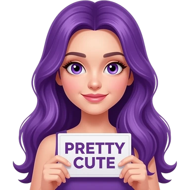 sexy girl with long purple hair and purple eyes holding a PRETTY CUTE sign emoji
