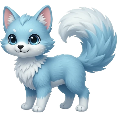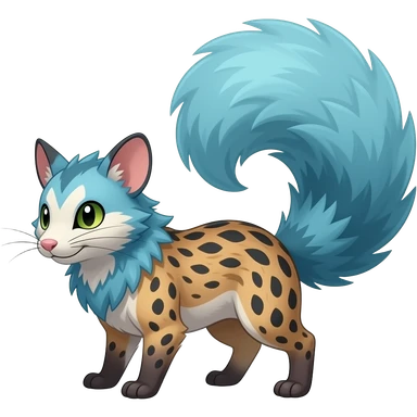 Cyan-blue, soft realistic romantic vintage antique divine beautiful elegant pretty precious cute young youthful Fakémon-Pokémon-opossum-feline-mouse-serval-caracal-chinchilla-Minccino-Cinccino-Meowstic-rodent-hybrid-creature with a big fluffy bushy tail (full body) emoji