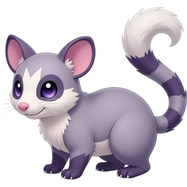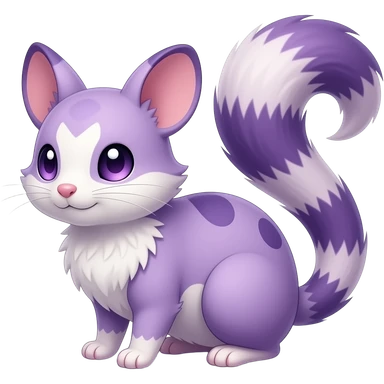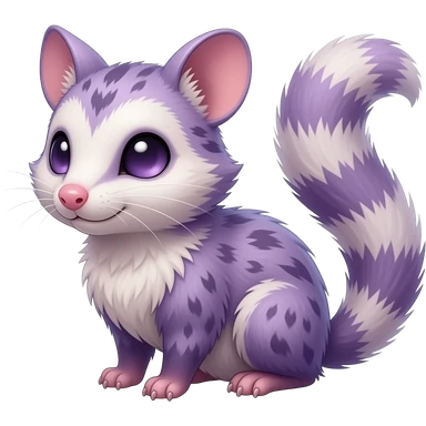 Purple, soft realistic romantic vintage antique divine beautiful elegant pretty precious cute young youthful Fakémon-Pokémon-opossum-feline-mouse-serval-caracal-chinchilla-Minccino-Cinccino-Meowstic-rodent-hybrid-creature with a tufted tail (full body) emoji
