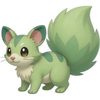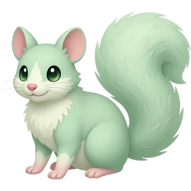 Light-green, soft realistic romantic vintage antique divine beautiful elegant pretty precious cute young youthful Fakémon-Pokémon-opossum-feline-mouse-serval-caracal-chinchilla-Minccino-Cinccino-Meowstic-rodent-hybrid-creature with a big fluffy bushy tail (full body) emoji