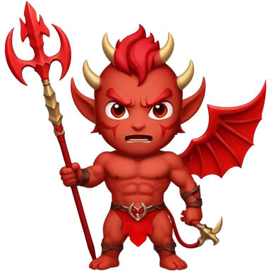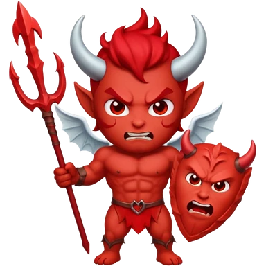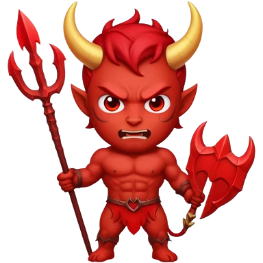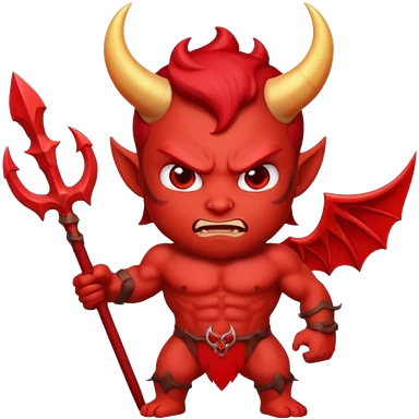 Emoji-style devil: red skin, horns, muscular body, red trident, angry face, same cute emoji style as the angel. emoji