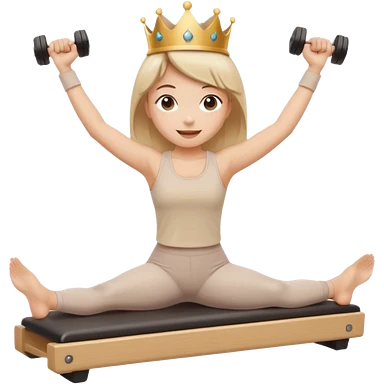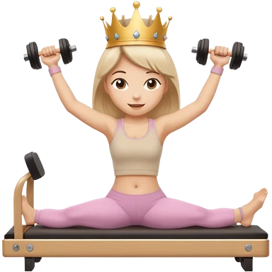 Cute sticker of a girl doing a Pilates stretch on a reformer while holding a cup of coffee in one hand. Wearing beige activewear and a small crown. Kawaii style, happy expression, vector, white outline, transparent background. emoji | AI Emoji Generator