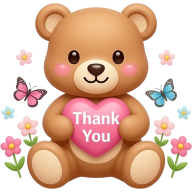 Cute teddy bear holding a pink heart that says “Thank You”, surrounded by tiny flowers and butterflies, pastel pink aesthetic, soft blush cheeks, kawaii cartoon style, adorable sticker design, soft glowing background. emoji