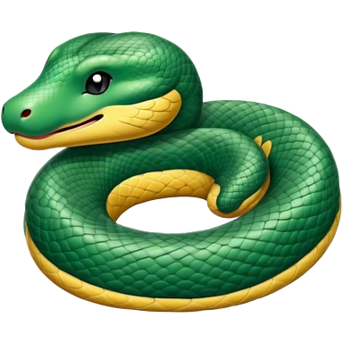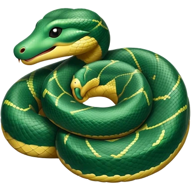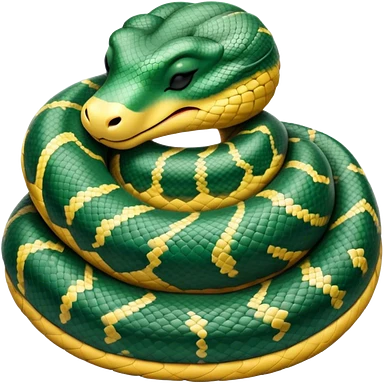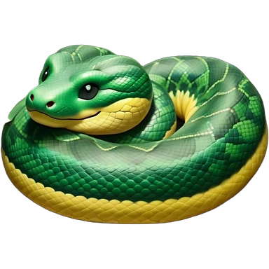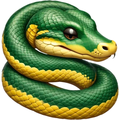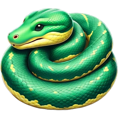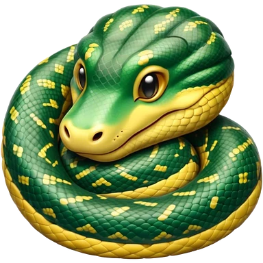 cinematic-green tree python-realistic-full-body-coiled-emoji,-thick-scaled-body-looped-tightly,-intricate-yellow and white-patterned-scales-reflecting-light,-head-tilted-dramatically,-cute-eyes-staring-calmly,-simplified-yet-realistic-focused-feature emoji
