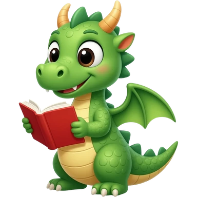 "Cute cartoon emoji of a green dragon reading a red book. Big eyes, friendly expression, bold outlines, vibrant colors, simple and clear for small size." emoji