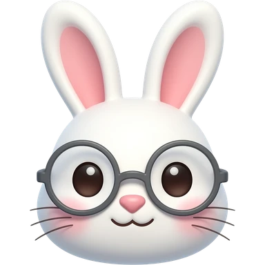 Cute white bunny face emoji wearing round glasses, soft pastel colors, light pink details, 3D emoji style, transparent background emoji