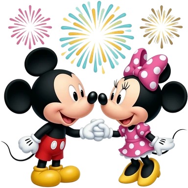 Cute kawii Mickey kissing Minnie Mouse under fireworks emoji
