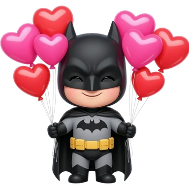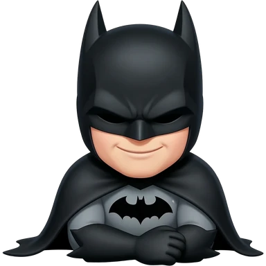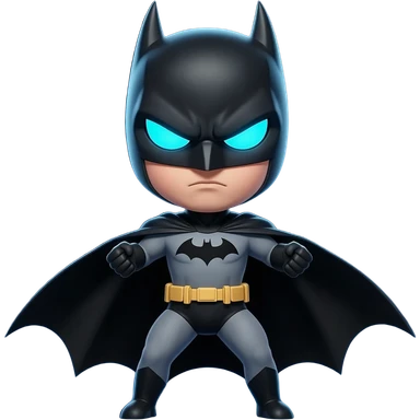 Cute Batman striking a dramatic hero stance with chest forward, glowing blue eyes, arms slightly raised, standing confidently against a dark blue gradient background, cinematic lighting emphasizing power and intimidation. emoji