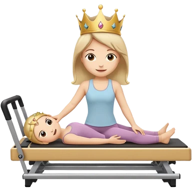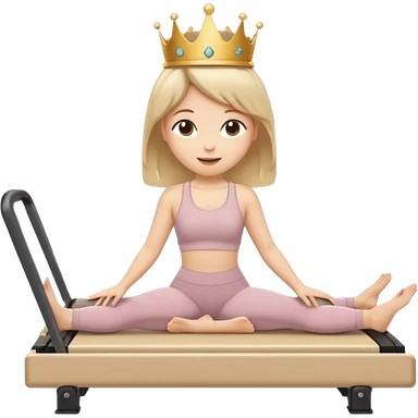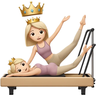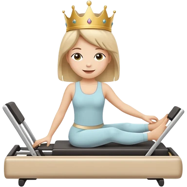 Cute sticker emoji of a “Pilates Princess” doing Pilates on a reformer machine. She is wearing beige activewear with a tiny crown. Soft kawaii style, round shapes, happy face. White outline, vector, transparent background. emoji