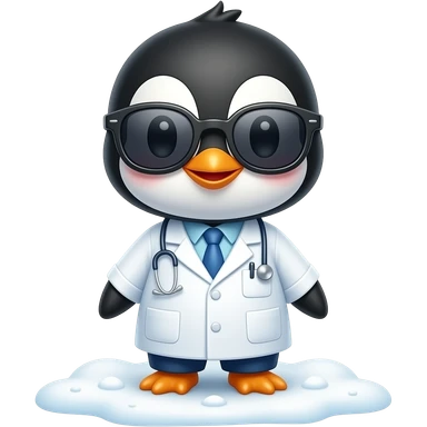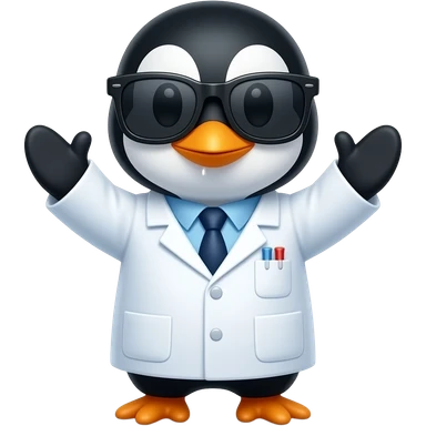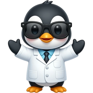 Cute chibi penguin wearing a white lab coat with shades on, smiling emoji