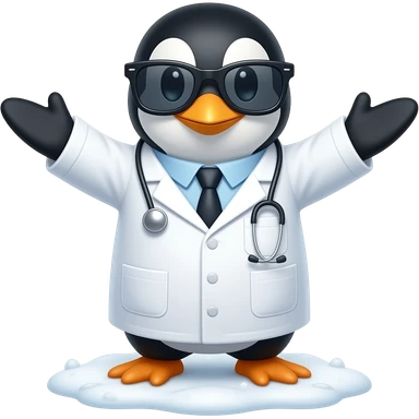 Cute realistic penguin wearing a white lab coat with cool swaggy shades on, being playful emoji