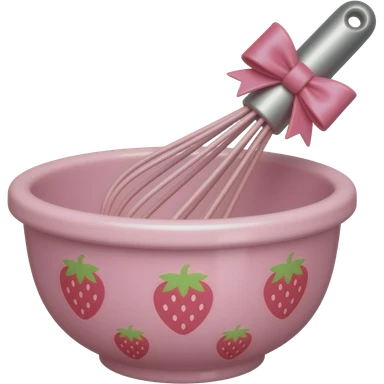 whisk with pink bow in a pink mixing bowl with strawberry designs emoji