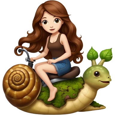 cute woman long wavy brown hair tattoos riding moss snail emoji