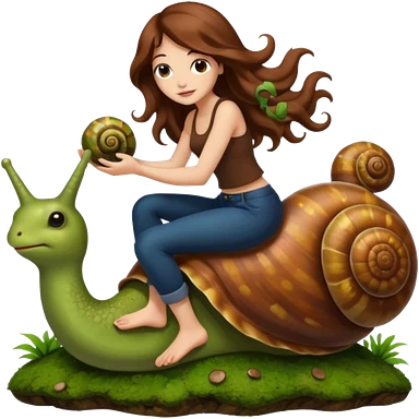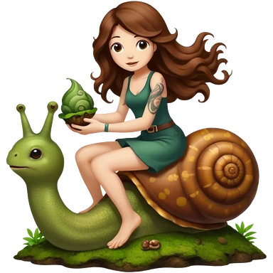 cute woman long curly brown hair tattoos riding giant snail emoji | AI Emoji Generator