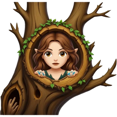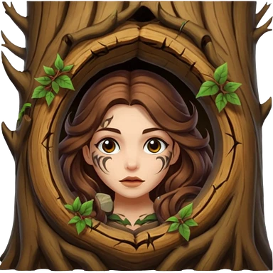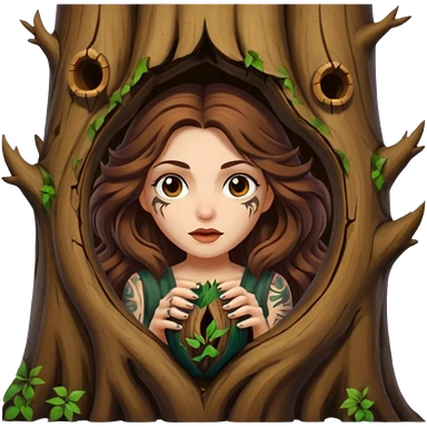 ute forest witch woman long wavy brown hair tattoos peeking from tree hollow emoji