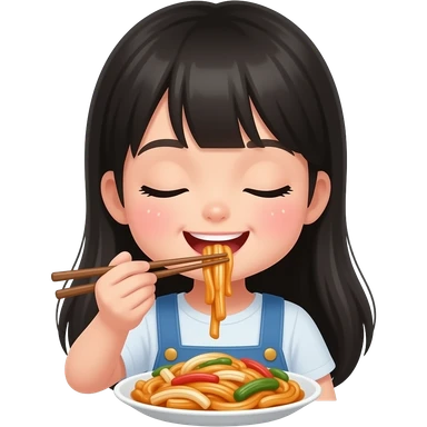 Cute Girl with long black hair eating japchae with 🥢 happy and close eyes emoji