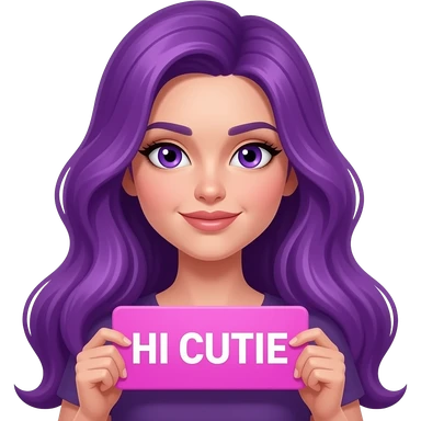 sexy girl with long purple hair and purple eyes holding a HI CUTIE sign emoji