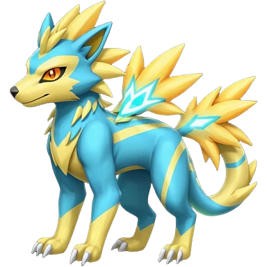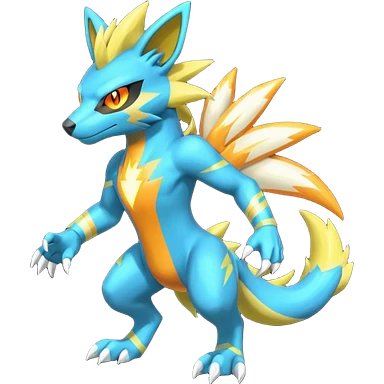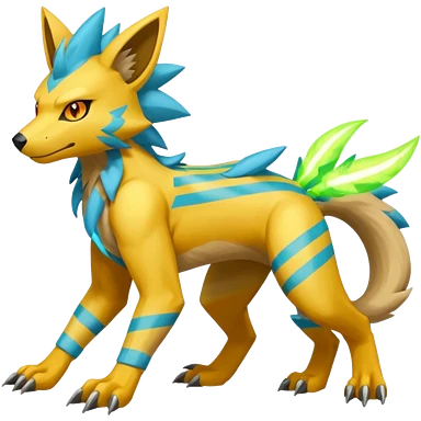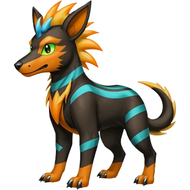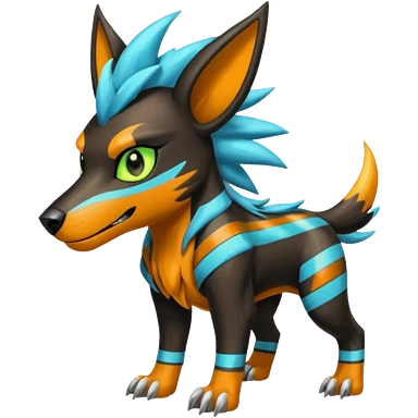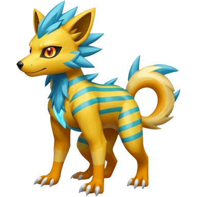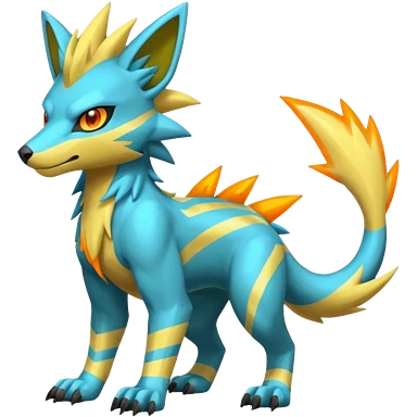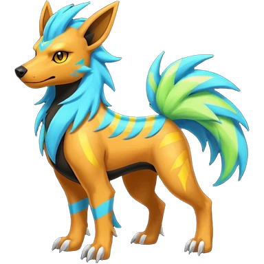 Cyan manectric-Electrike-Zeraora-Houndoom-fusion with neon-green stripes and orange eyes emoji