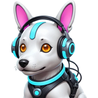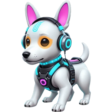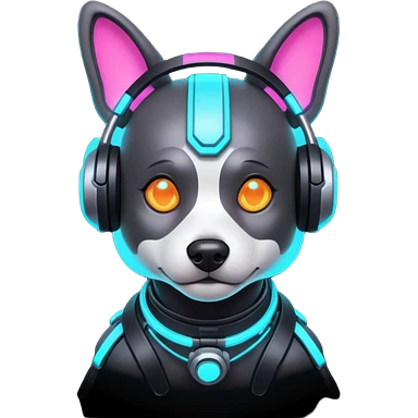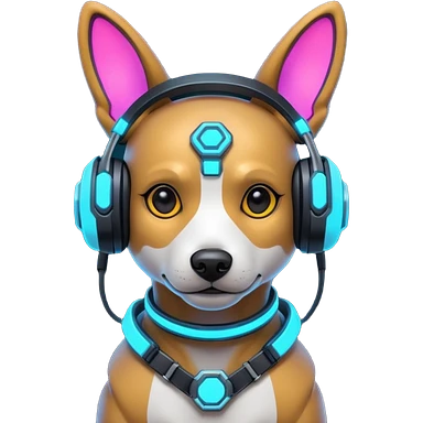cute cyberpunk dog, futuristic headset, neon harness, glowing cyber implants, street punk vibe, 3D cartoon, mobile game icon style, clean background, no text, no watermark emoji