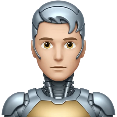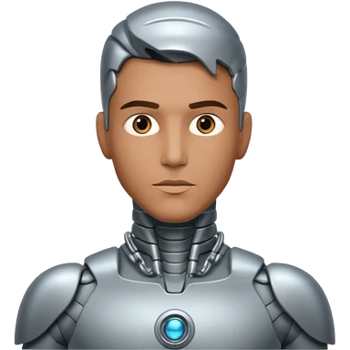 Bionic robot man with white hair and beard and blue human eyes flexing muscly arms and lifting weights emoji