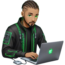 Light skinned African American male with green eyes as a cyberpunk hacker with cornrows hairstyle but short cornrows with only goatee facial hair coding on laptop emoji