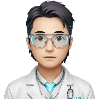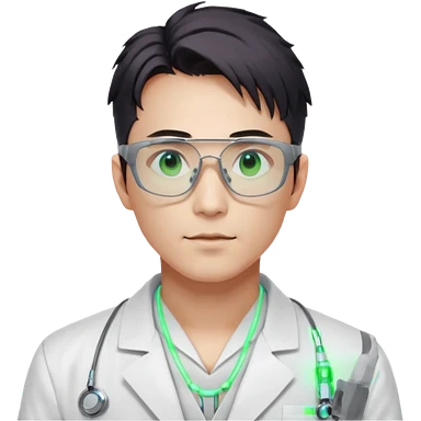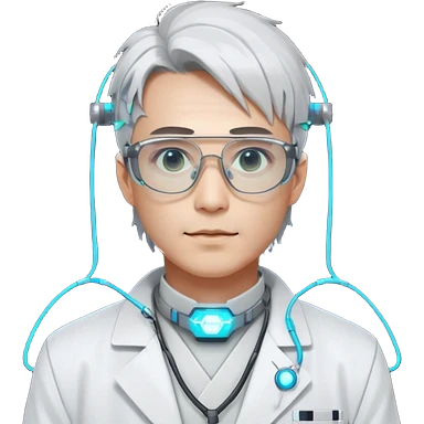 Cyberpunk scientist, Japanese male, high-tech glasses, glowing data reflection on lenses, lab coat collar, neural interface on temple, white neon lighting emoji