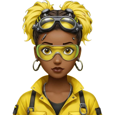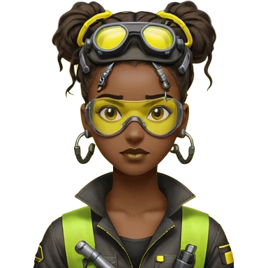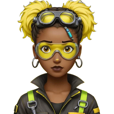 Cyberpunk black female mechanic, yellow tech goggles on forehead, messy hair bun, ear piercings, tool collar, grease smudge on cheek, focused expression, neon yellow lighting emoji