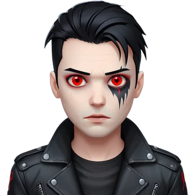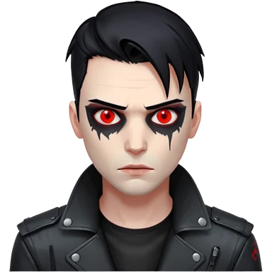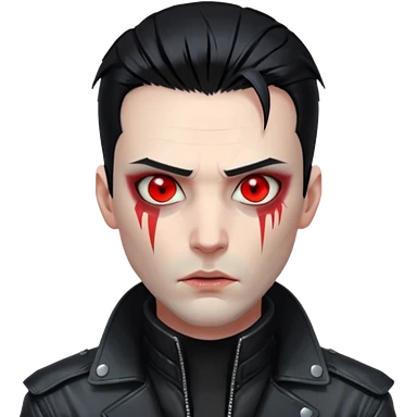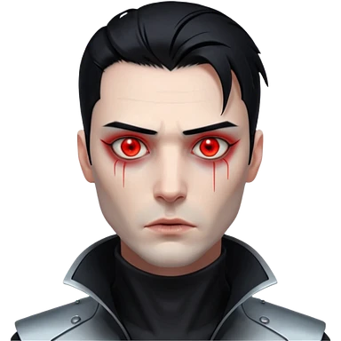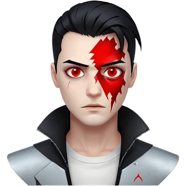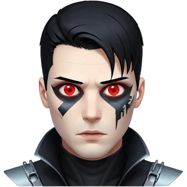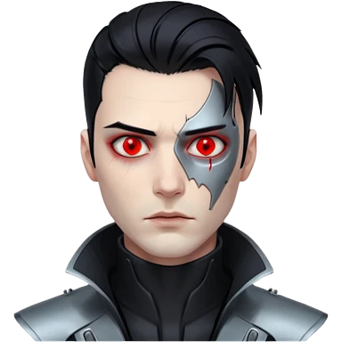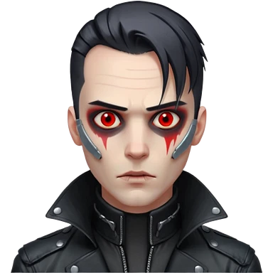 Cyberpunk man, slicked hair, silver metal jaw prosthetic, glowing red eyes, cold expression, clinical lighting emoji