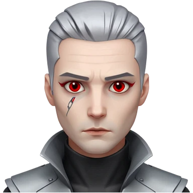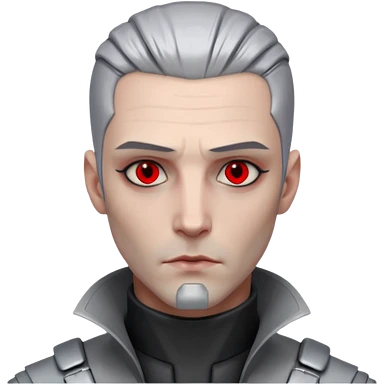 Cyberpunk man, grey slicked hair, silver metal thick prosthetic jawline, red eyes, cold expression, clinical lighting emoji