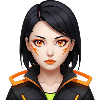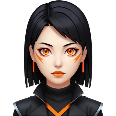 Cyberpunk Japanese woman, mid-50s looking young, sharp features, sleek black hair, glowing orange eyes, vengeful expression, neon highlights. emoji