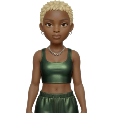Cynthia Erivo with blonde short hair, dark green metallic crop top, dark green metallic baggy pants, silver necklace emoji