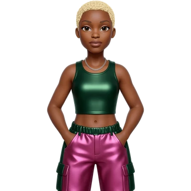 Cynthia Erivo with blonde short hair, dark green metallic crop top, dark green pink metallic baggy pants, silver necklace emoji