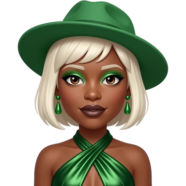 Cynthia Erivo with dark brown eyes, short platinum blonde hair, green hat, green eyeshadow, dark brown lipstick, dark green metallic halter dress, green earrings emoji
