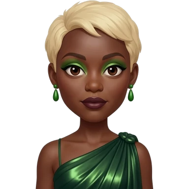 Cynthia Erivo with dark brown eyes, short blonde hair, green eyeshadow, dark brown lipstick, dark green metallic grecian dress, green earrings emoji