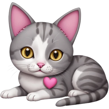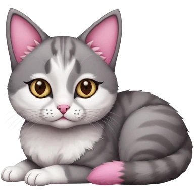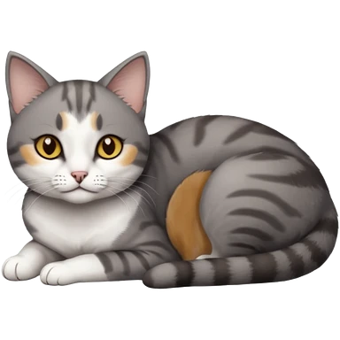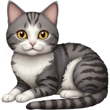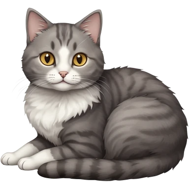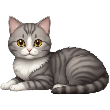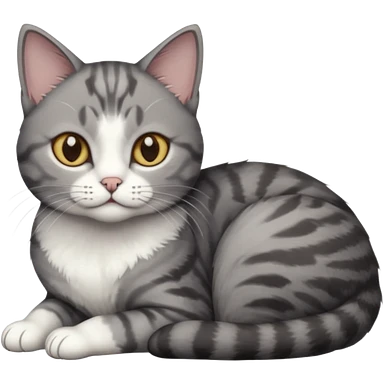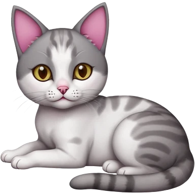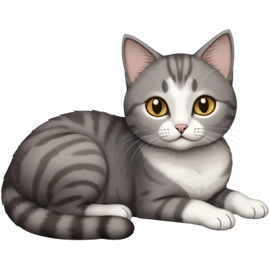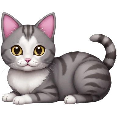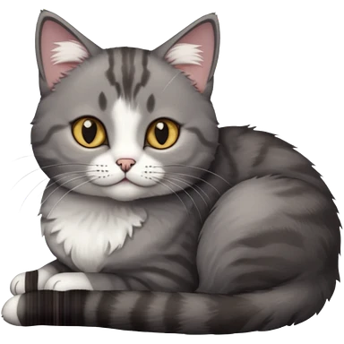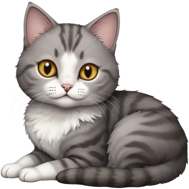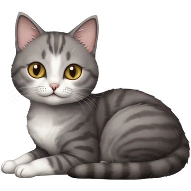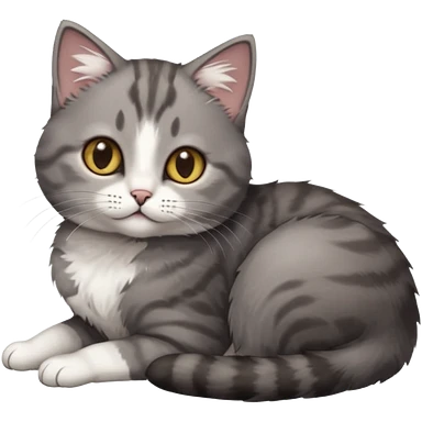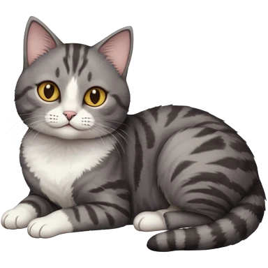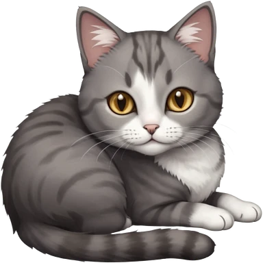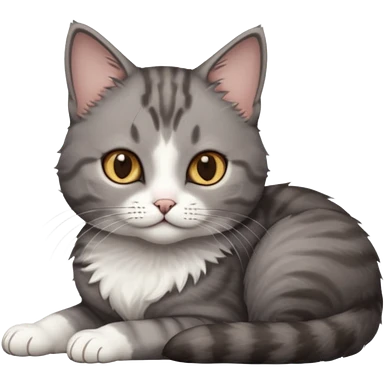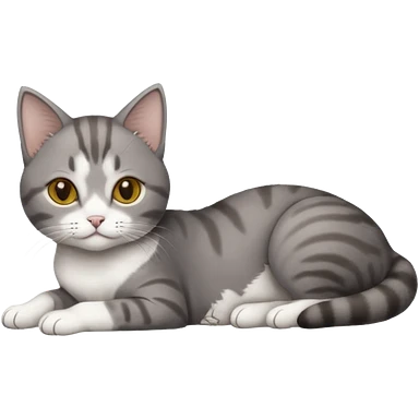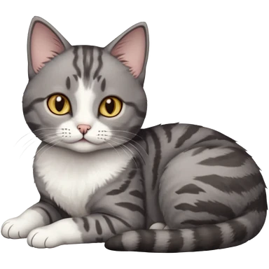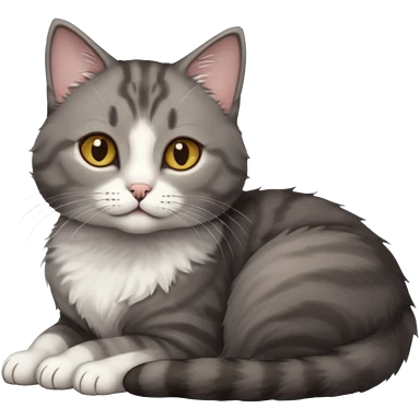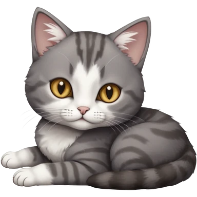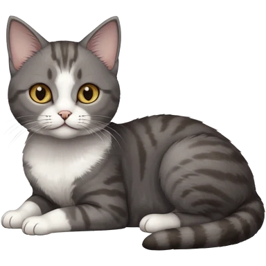 full body tiny short hair dark grey and white cat with hazel eyes lying down emoji