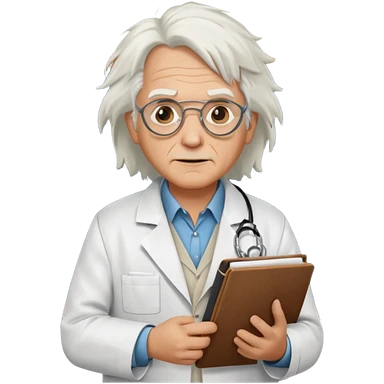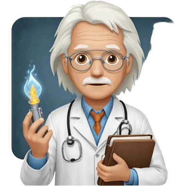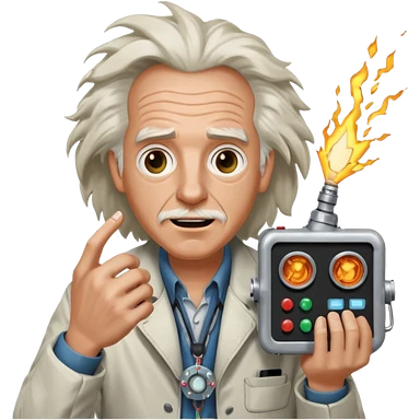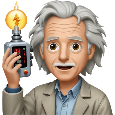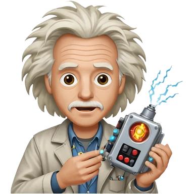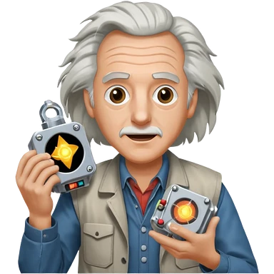 Doc Brown from Back to the Future, holding a flux capacitor, excited face, wild hair emoji