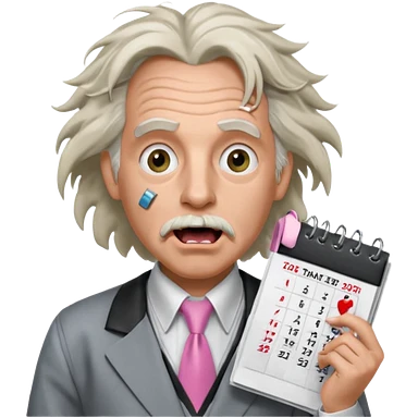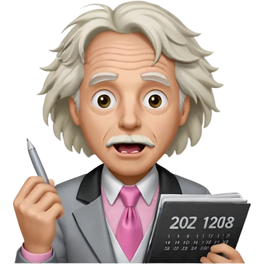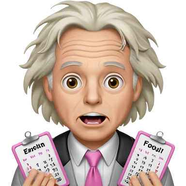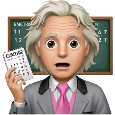 Doc Brown, in Back to the Future, with his hair all over the place and his mouth wide open. No glasses. Wearing a silver dress with black trim, a pink collared shirt and a white tie, holding a calendar. emoji