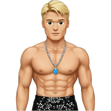 Dolph Lundgren with black sequin baggy pants, shirtless with necklace emoji